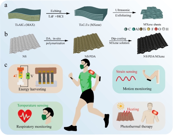 针对以上问题,伟德bv1946王潮霞教授和加拿大滑铁卢大学Yuning Li 教授提出了一种具有多功能传感能力和自供电潜力的MXene热电织物。这种以织物为基材的可穿戴热电器件,利用织物基材自身的柔韧性和透气性,成功解决了人体穿着舒适性问题。而基于MXene材料设计的热电织物在温度传感和应变传感方面都表现出色,是连续数据收集和监控的理想选择。这种将MXene材料和与纺织技术相结合的能力,推动可穿戴智能织物的发展,使智能织物离实用更进一步,展示了在能量收集、运动跟踪和健康监测方面具有广阔的应用前景。