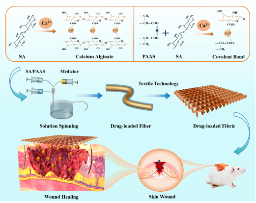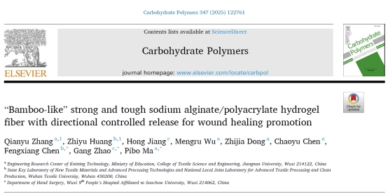 近日,bv伟德国际1946针织技术教育部工程研究中心蒋高明教授团队在材料领域一区TOP期刊《Carbohydrate Polymers》(IF=10.7)上发表题为““Bamboo-like” Strong and Tough Sodium Alginate/Polyacrylate Hydrogel Fiber with Directional Controlled Release for Wound Healing Promotion”的研究论文。伟德bv1946蒋高明教授团队马丕波教授、武汉纺织大学陈凤翔教授与无锡市第九人民医院赵刚教授为论文共同通讯作者。该研究得到了国家自然科学基金(52373058,11972172)、湖北省自然科学基金(No.2023AFB828)、湖北省自然科学基金创新团队计划(No.2023AFA027)、中央高校基本科研业务费专项基金(JUSRP62005)、江苏高校优势学科建设工程项目 (PAP)、无锡市卫生部重点科研项目(Z202219)、湖北省数字化纺织设备重点实验室开放基金(No.2023022)、国家地方联合纺织先进加工与清洁生产实验室开放基金(No.17);江苏省研究生科研与实践创新项目(KYCX24_2555)的支持。