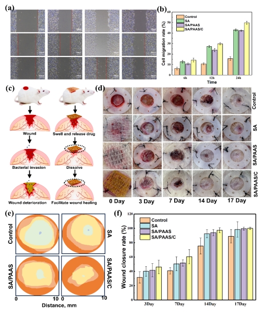 图5 体内细胞迁移结果及伤口愈合结果 (a)不同时间细胞迁移图像;(b)不同时间各组细胞迁移率;(c)水凝胶纤维织物促进伤口愈合示意图;(d)不同实验组在第0、3、7、14、17天伤口愈合的代表性照片;(e)不同实验组伤口愈合过程;(f) 不同实验组在第3、7、14、17 天的伤口愈合率