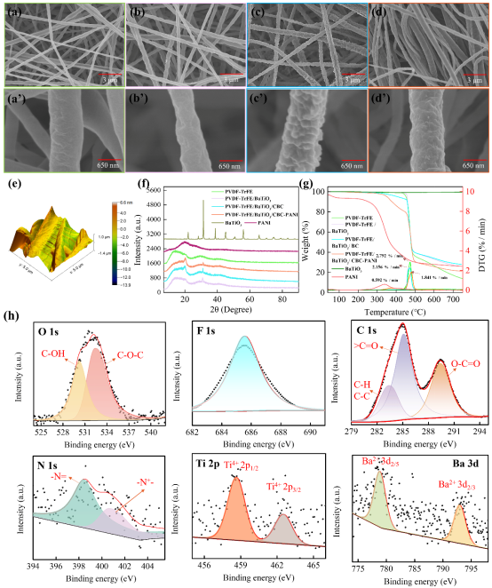 图2. PVDF-TrFE/BaTiO3/CBC-PANI纳米纤维膜基本表征