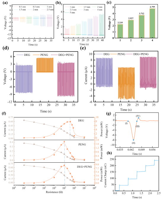 图3. DEG、PENG和DEG+PENG的结构优化及输出性能表征。