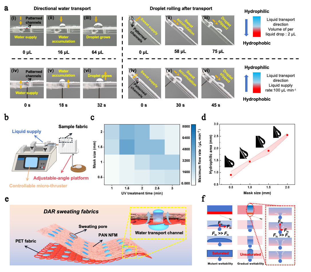 图3 DAR织物的定向导水能力。a)当液滴体积为2 μL或供液速率为100 μL·min-1(单通道直径为1.5 mm)时,DAR织物的水运输过程。b)自行设计的角度可控供液装置。c)导水速率随不同掩膜尺寸和紫外光辐照时间的变化规律。d)选择性紫外光辐照处理后实际亲水面积与掩膜尺寸大小的变化规律。e)具有非对称孔隙结构的DAR织物及其水运输通道(仿汗腺)示意图。f)突变润湿性Janus织物与渐变润湿性DAR织物的定向导水机理。