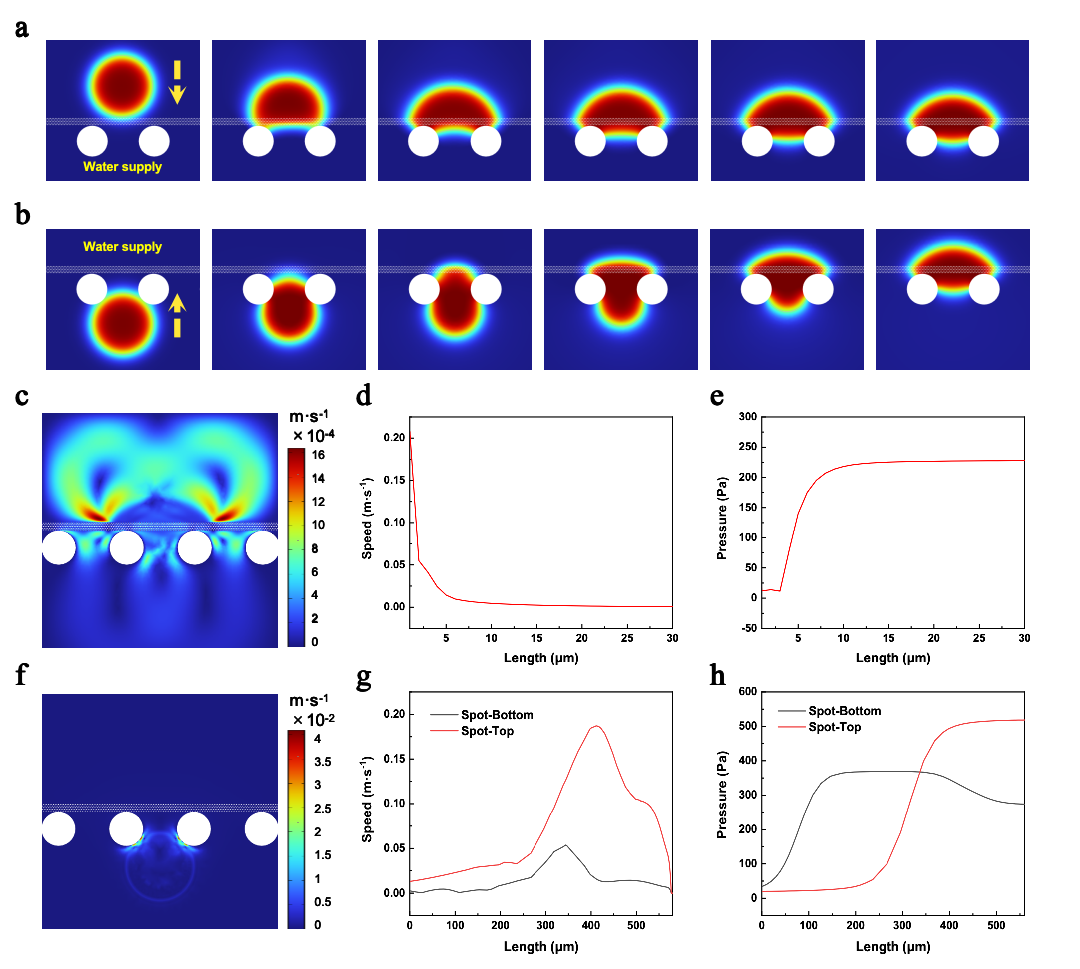 图4DAR织物定向导水机理的数值分析。液滴从a)顶部和b)底部接触DAR织物后,图案化导水通道中的水运动模拟图。液滴在稳态下从顶部接触DAR织物后不同y轴位置的c)速度分布图、d)速度分布曲线和e)压力分布曲线。液滴在稳态下从底部接触DAR织物后不同y轴位置的f)速度分布图、g)速度分布曲线和h)压力分布曲线。