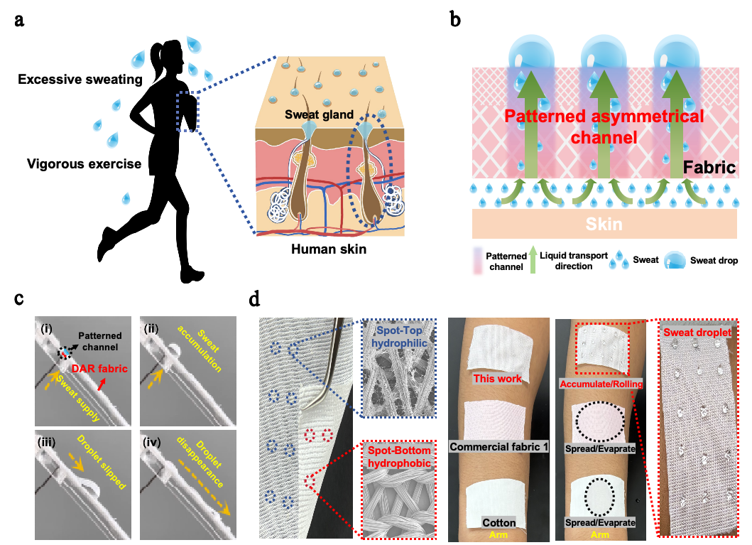 该研究受人体汗腺启发,成功开发出一种具有图案化不对称结构的“排汗织物”,使每个单独的汗液传输通道都具有物理和化学不对称性(孔径差异和局部渐变润湿性),使织物像皮肤一样通过“汗腺”通道将汗液反重力定向输送至织物外表面并聚集成汗滴,随人体摆动可轻松滑落(滚动角约45°)。该排汗织物的单向导水速率高达12.2 mL·cm-2·min-1,远超人体出汗速度,实现了可持续的汗液管理。为伤口护理,生物流体监测和微流体控制的先进纤维材料的开发提供了有效策略。论文第一作者为朱豆豆博士,伟德bv1946付少海教授为通讯作者。