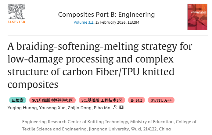 近日,我院针织技术教育部工程研究中心蒋高明教授研究团队在复合材料领域顶级期刊《Composites Part B: Engineering》(IF=14.2)上发表题为“A Braiding-Softening-Melting Strategy for Low-damage Processing and Complex Structure of Carbon Fiber/TPU Knitted Composites”的研究论文。该研究提出一种“编织-软化-熔融”策略,基于热塑性聚氨酯(TPU)包覆碳纤维的核壳结构复合纱线,实现低损伤加工制备结构复杂的CF/TPU针织复合材料。该研究为实现碳纤维的低损伤加工、力学性能可设计性与复杂结构可编织性提供了一种创新策略。bv伟德国际1946针织中心2023级博士研究生黄玉清为论文第一作者,马丕波教授为本文通讯作者,伟德bv1946为唯一署名单位。