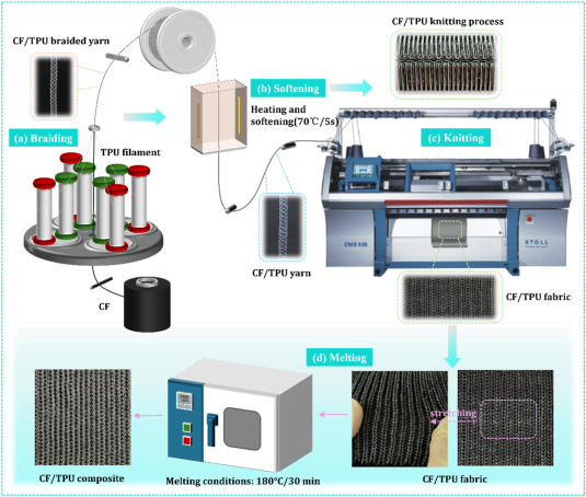 图2 CF/TPU针织复合材料的制备过程(a)编织;(b软化;(c)针织;(d)熔融