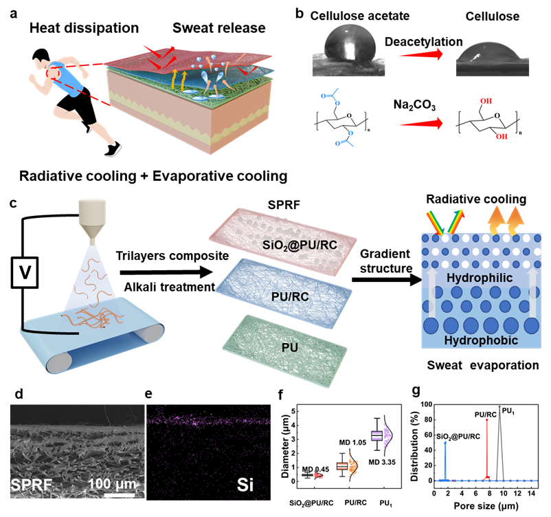 在开发下一代高性能织物时,热管理和水分传递对人体舒适度至关重要。然而,大多数柔性辐射制冷材料依赖于均匀或随机多孔结构,无法精确响应整个太阳光谱,这限制了其优化冷却效果的能力。为了在紫外-可见光区(UV-Vis)和近红外区(NIR)实现精确散射,调控多孔结构的直径以与太阳辐射波段重叠是提高太阳辐射反射率的必要条件。疏水聚合物热管理材料忽视了人体的湿舒适性,导致冷却效率降低。在辐射冷却材料上建立长期稳定的Janus排汗结构对于高效且持久的身体热管理至关重要。