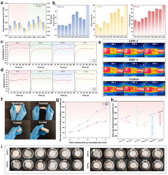 此外,该面料在室温环境下可降低皮肤表面温度1.8°C,蒸发速率显著优于传统织物;内侧含水量仅16.4%(棉织物为35.6%),有效缓解粘腻感,且耐磨性优异(4000次摩擦无破损)。此项研究为开发高舒适性、无能量输入的智能热湿管理纺织品提供了新的仿生策略,在运动服装与户外装备领域具有广阔应用前景。