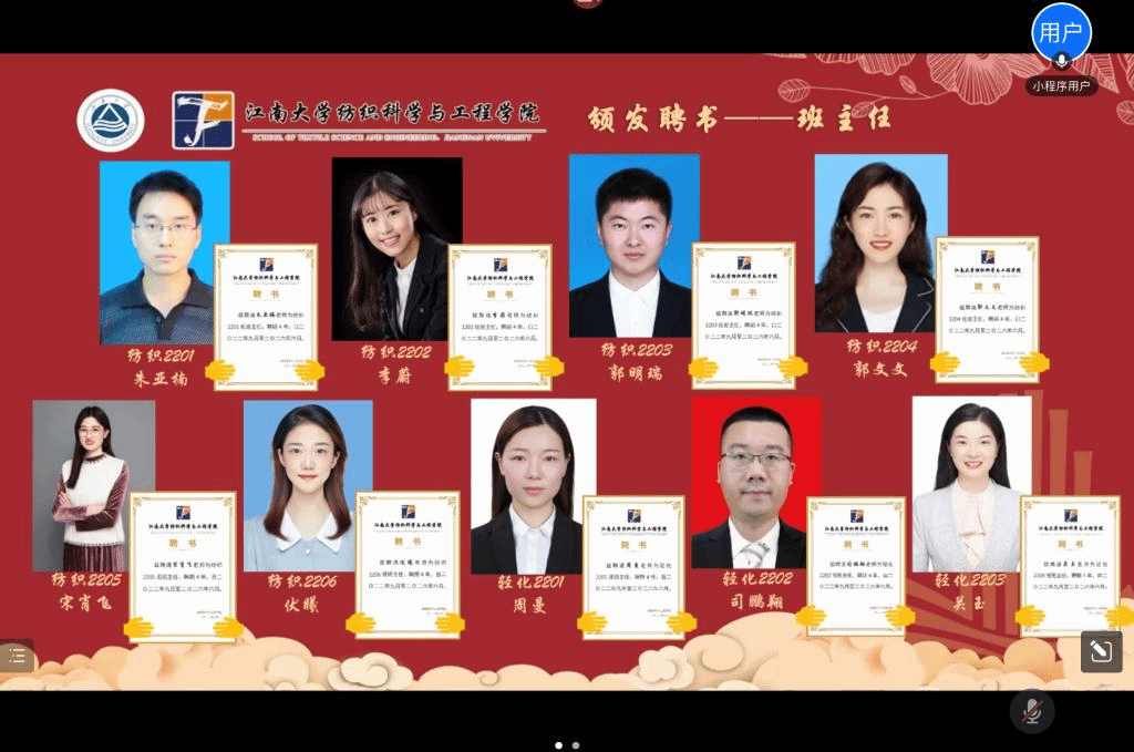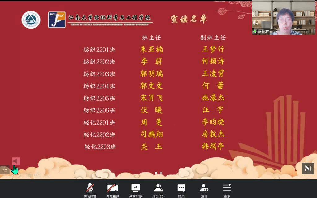 会上,陈艳君宣读了《bv伟德国际19462022级新生班主任聘任名单》,张菁为朱亚楠等9位班主任和王梦竹等9位副班主任线上一键颁发聘书。