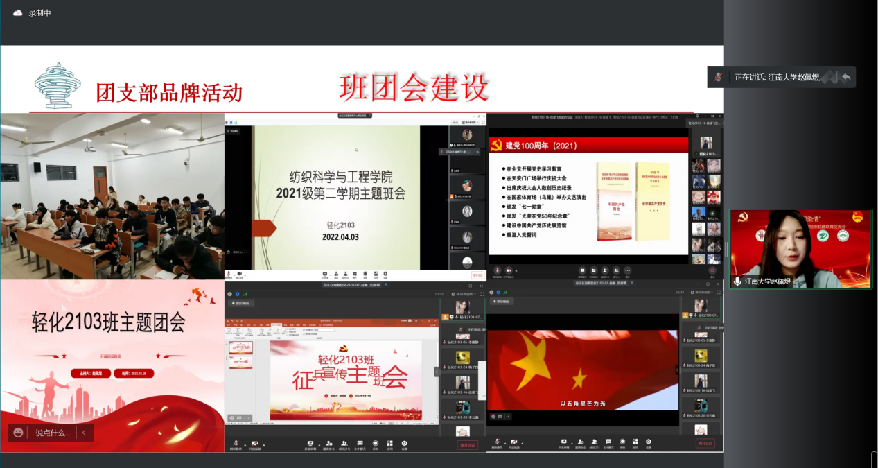活动中,五校共建学院党委副书记分别致辞讲话,我院党委副书记陈艳君在致辞中对本次活动提出三点希望:一是希望学习到兄弟高校宝贵的党建、团建方面的先进做法和经验;二是希望同学们在活动中得到思想的启迪、精神的升华、格局的提升;三是希望我们“这一次”的“屏对屏”,尽快实现“下一次”的“面对面”。同时,五校共建学院团委书记、党支部书记、团支部书记分别就团学共建、党支部共建、团支部共建交流发言并在各自分会场进行分享研讨,我院团委书记陈裕老师从“思想引领”、“组织建设”、“创新创业”、“社会实践”、“志愿服务”、“校园文化”、“年度创新”等维度介绍学院共青团工作开展情况,陈裕老师还分享了关于纺织类高校共青团工作的几点思考:共青团工作如何与学科发展、文化传承有机结合需进一步搜索;共青团工作品牌创建任重且道远,宣传方法与形式需推陈出新;共青团工作应在学生“输入”与“输出”平衡中提升贡献度。我院20纺硕党支部书记江洋同学,在会上介绍到“研本互动”、“三大系列活动”、“特色党小组创立”等支部特色,并提倡以后要多多开展党支部之间的“经验交流”、“资源和成果共享”活动。我院轻化2103班团支部书记赵佩煜同学分享了担任团支部书记近一年来的工作任务和工作方法,以及取得的工作成效。