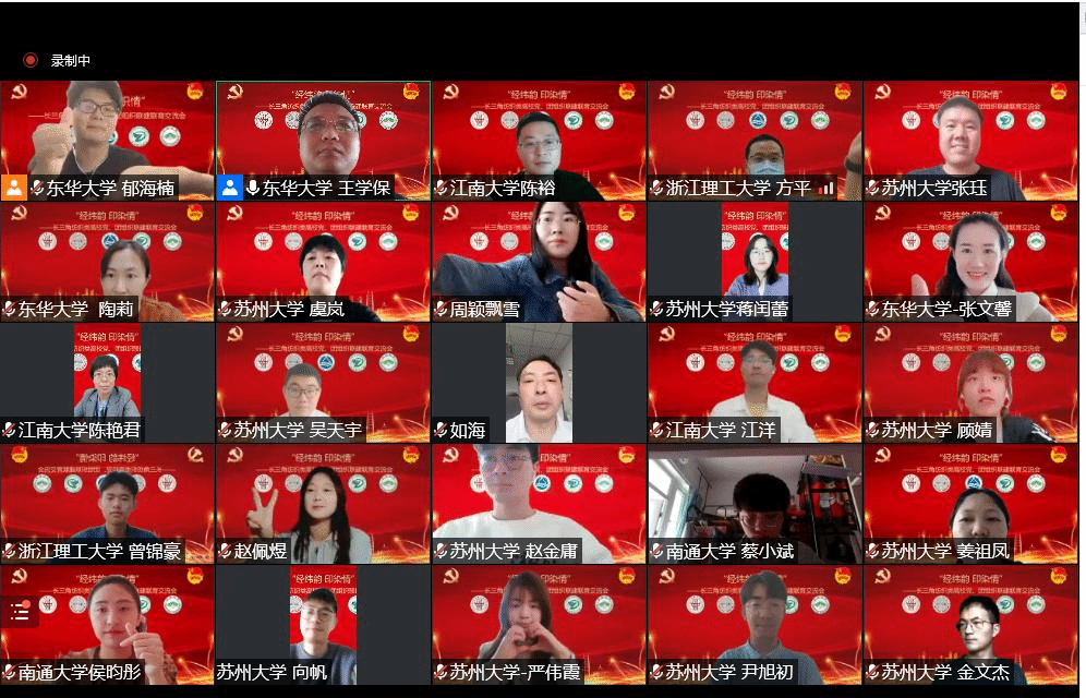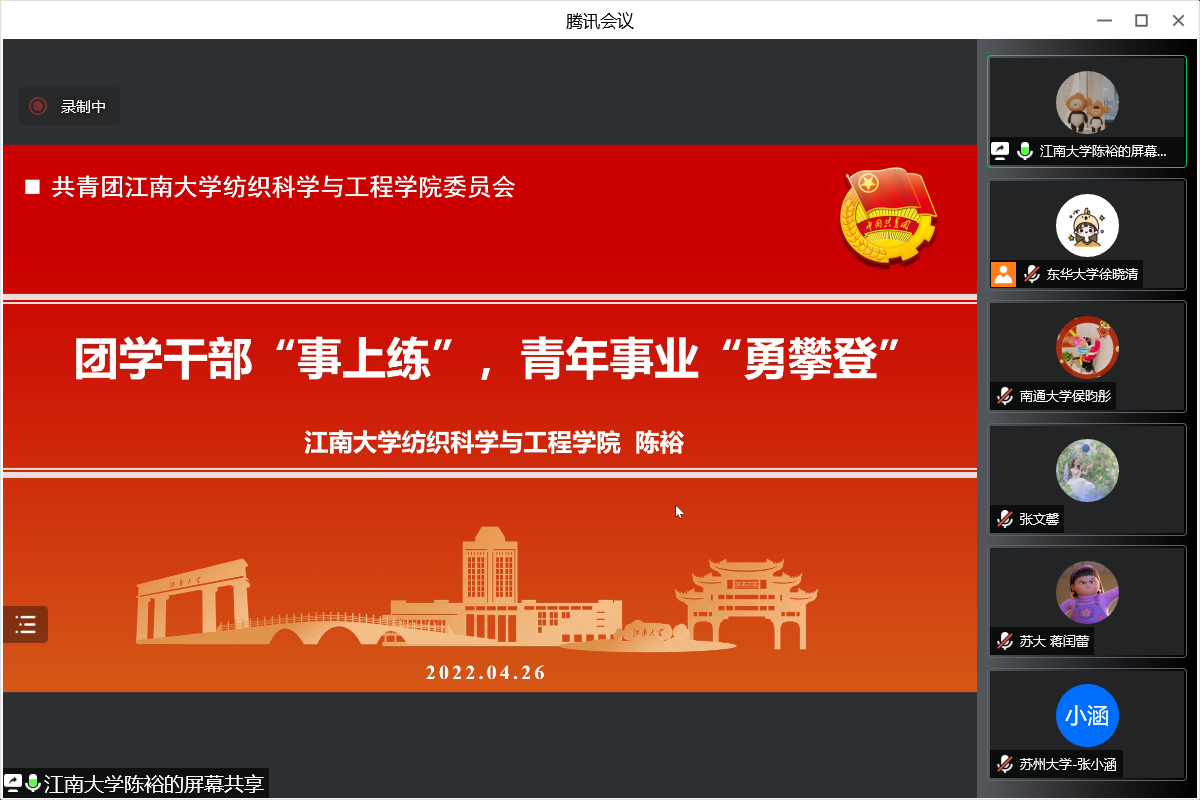 为以崭新的面貌、奋进的姿态迎接党的二十大胜利召开,同时进一步加强新形势下党团组织建设,强化党团组织之间交流合作,实现“党建强、发展强”的目标,构建“资源共享、优势互补、同心协力、进取共赢”的党团建设工作新格局。4月26日下午,bv伟德国际194690名师生,参加由东华大学化学化工与生物工程学院发起主办的“经纬韵 印染情”——长三角纺织印染类高校党、团组织联建联育工作交流会,交流会设主会场和面向团委书记、党支部书记、团支部书记的三个分会场,活动通过腾讯会议开展。来自东华大学、苏州大学、伟德bv1946、浙江理工大学、南通大学五校共建学院的党委副书记、学工办主任、团委书记及15个党、团支部500余名师生相聚“云端”,就纺织印染类高校党团组织建设建言献策,通过交流分享,集思广益,共同助力联建联育成效落到实处。交流会由东华大学化学化工与生物工程学院学工办主任王学保老师主持。