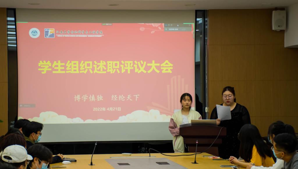 为严格落实疫情防控相关要求,此次会议采取线上线下相结合的形式开展。会中,学院学生会、学风促进中心、大学生融媒体中心、科技艺术中心、青年志愿者协会各部门代表依次从部门概况、年度工作总结、未来工作展望等方面进行述职并进行互评打分,学院研究生会以书面报告形式参加本次述职评议会,此外会上还对获评“优秀干事”的同学予以表彰。