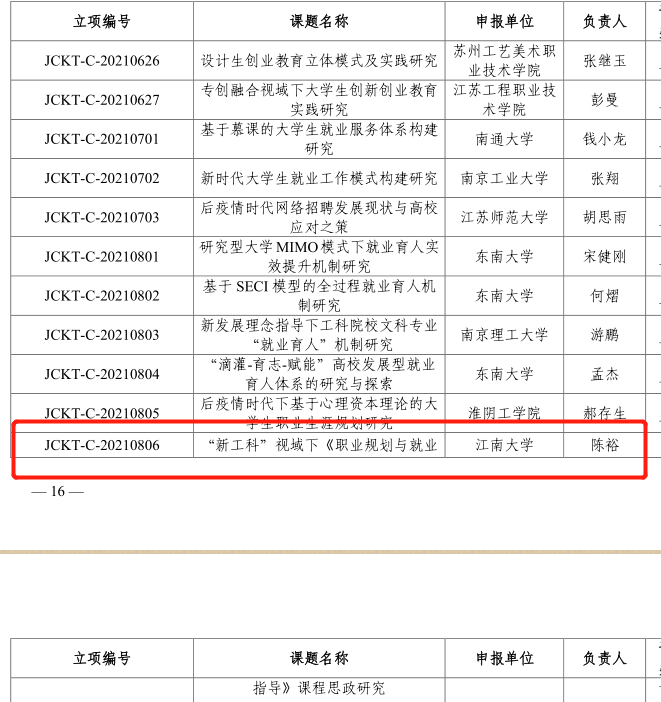 近日,江苏省高校招生就业指导服务中心发布了《关于公布2021年江苏省高校毕业生就业创业研究立项课题的通知》,经专家评审及公示,学院辅导员陈裕老师主持申报的课题《“新工科”视域下<职业规划与就业指导>课程思政研究》获批立项。