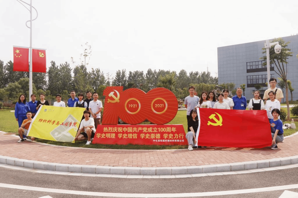 为庆祝中国共产党成立100周年,深入推进党史学习教育,丰富党建载体,大力推进“产学研”融合发展,7月9日,学院分团委书记陈裕、19纺硕党支部党员、殷茂力博士、陈亚君博士一行22人赴扬州中化高纤集团,开展“建党100周年忆初心,校企携手共育人”的支部共建主题党日活动。中化高纤总经理、党支部书记赵开荣、副总经理曹煜彤、党群和人力资源部主任沙婷玥及集团党员代表出席上述活动。