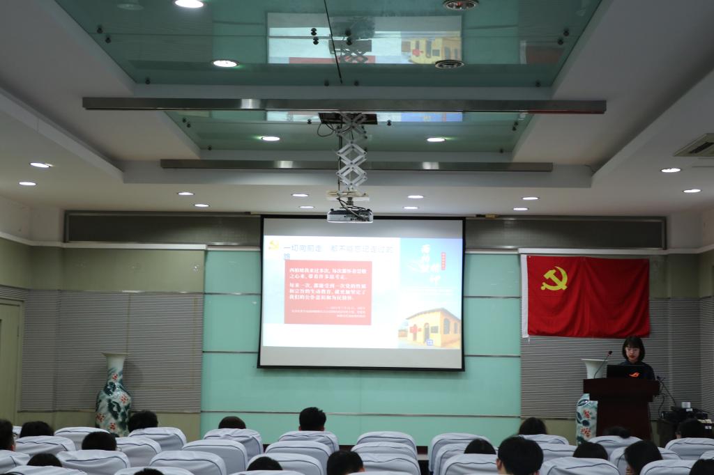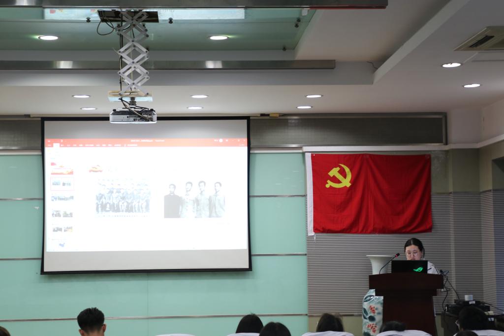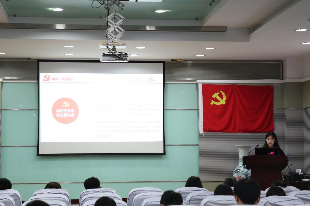 报告会伊始,由纺织本科生党支部党员代表介绍了建党初期的有关内容,她围绕中国共产党诞生的原因、五四运动、中国共产党早期组织的建立、中共一大的召开四个方面讲述了党成立的过程,让同学们看到了先辈为建党做出的不懈努力,并明白了建党是历史的选择,是必然的选择。