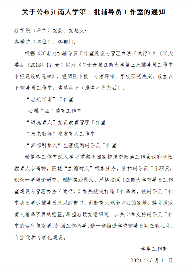 近日,根据学校《关于开展伟德bv1946第三批辅导员工作室申报建设的通知》,学院党委副书记陈艳君主持申报的“启航江南”辅导员工作室获批伟德bv1946第三批辅导员工作室立项建设。