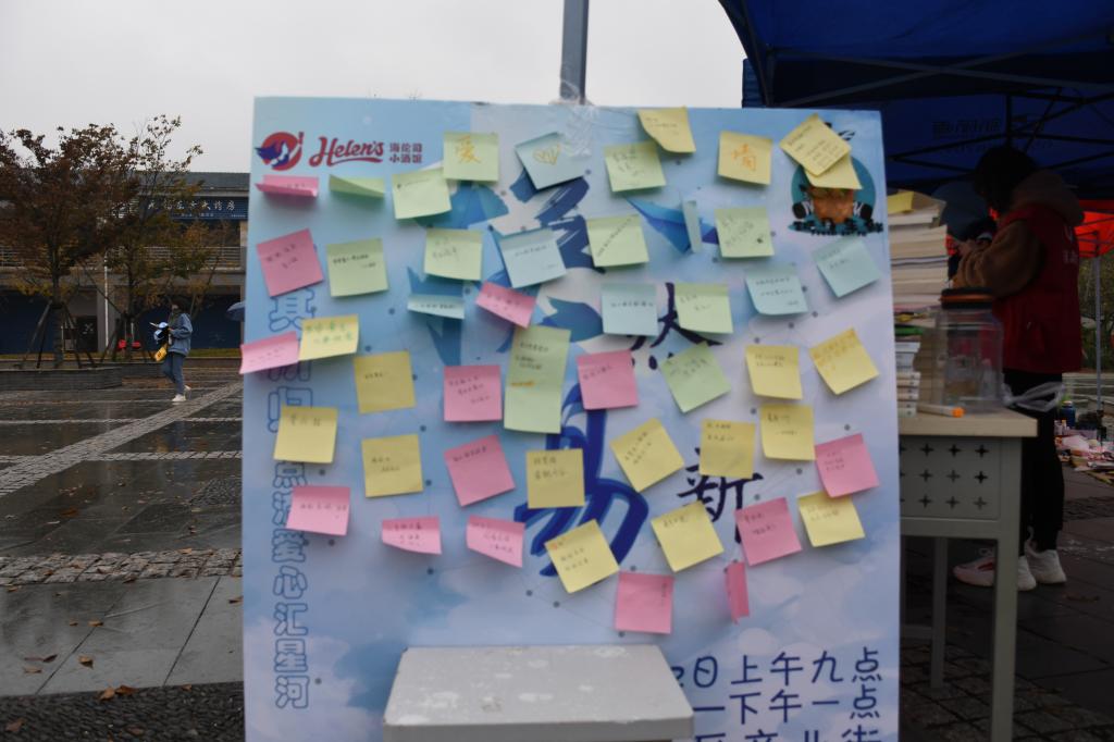 通过前期走访宿舍和线上宣传,纺织学院青年志愿者协会的志愿者们收集到了各类闲置物品。其中包括:毛绒玩具、名著类书籍、生活用品等。活动当天,参与以物换物的小伙伴,以及向偏远地区献爱心的同学们都十分积极,虽然活动当天细雨蒙蒙,但仍然没有浇灭江南学子参与活动以及传递爱心的热情。本次活动还专门设置了爱心墙,爱心墙上的文字虽然简短淳朴,但字里行间透露出着江南学子对偏远地区孩子们的关心,相互之间鼓励奋进的话语,以及对本次活动的大家赞赏。