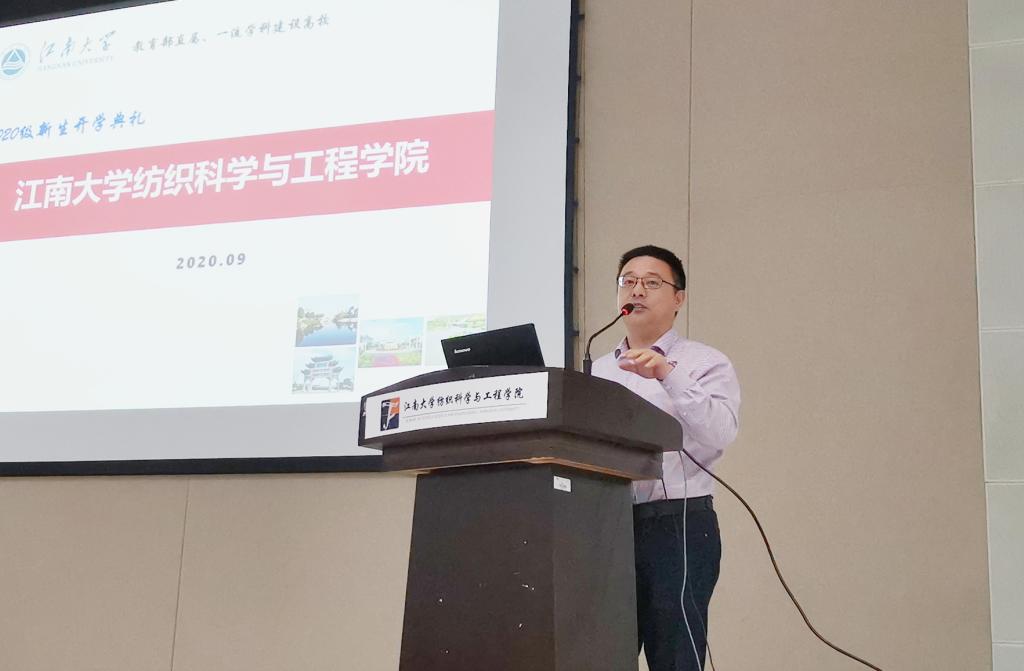 院长付少海教授作学院介绍,付院长首先从纺织行业的地位、纺织创新发展动态、纺织产业创新驱动发展三方面入手,向同学们系统地讲述了什么是当代的纺织,现代纺织行业的研究重点及方向。随后付院长介绍了伟德bv1946及bv伟德国际1946的历史沿革和发展方向,并着重介绍了纺织和轻化两个专业的建设情况、师资队伍、学科优势及特色、各科研团队的科研成果及获奖。在人才培养方面,付院长还着重介绍了全员参与的卓越工程师的培养计划、全员覆盖的大学生创新活动及伟德bv1946-北卡罗莱纳州立大学3+X本硕培养项目。此外,付院长还就学院升学深造率、就业质量、第二课堂成果、杰出校友、奖助学金体系及纺织教育发展基金会等方面做了详细介绍。最后,付院长也告诫2020级本科新生,要确立自己的人生定位,做好大学发展规划;要养成良好的生活习惯,保持健康的体魄和心理;要不断拓宽学术视野,学会思考问题,提高文化修养。