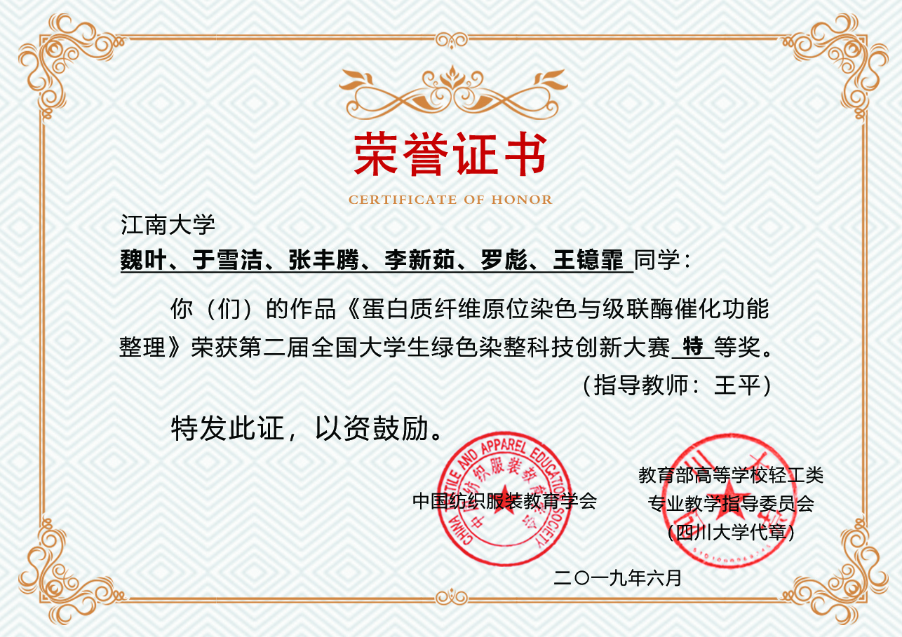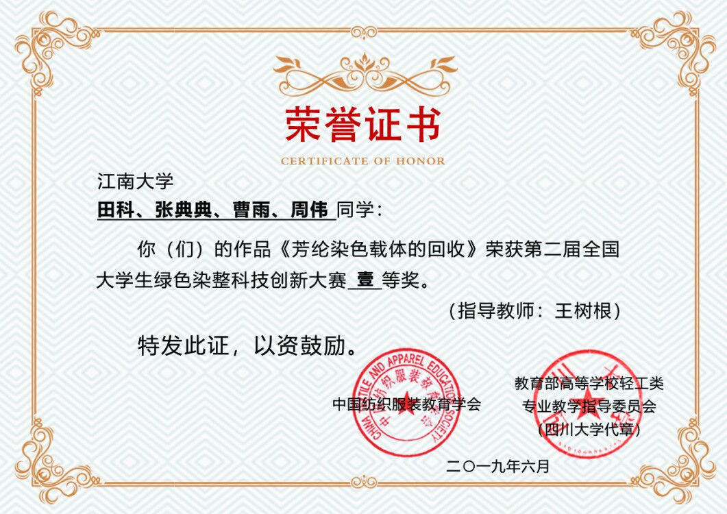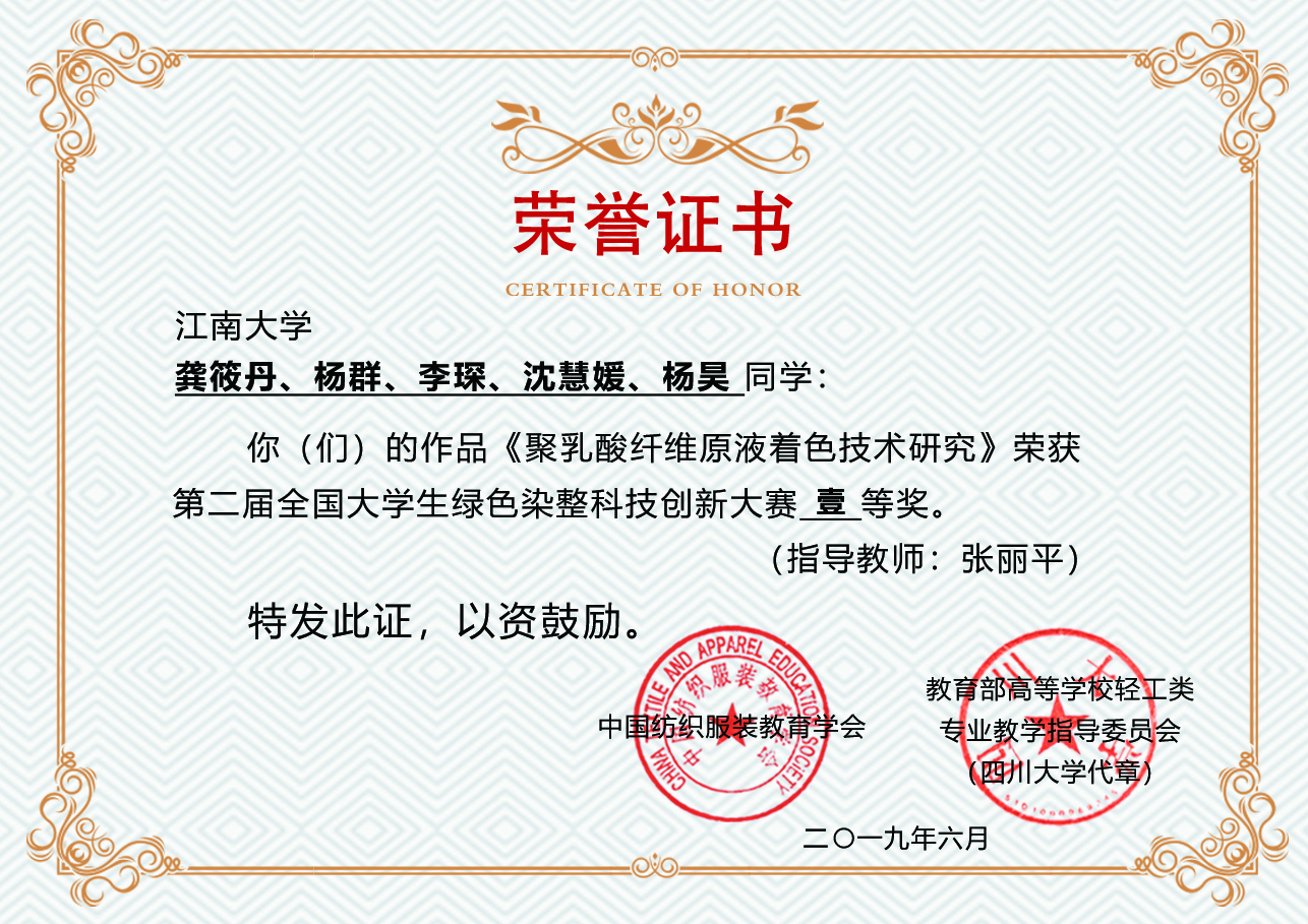 伟德bv1946纺织服装学院共5项作品参评,由王平老师指导的项目《蛋白质纤维原位染色与级联酶催化功能整理》(学生负责人魏叶)荣获特等奖;由张丽平老师指导的项目《聚乳酸纤维原液着色技术研究》(学生负责人龚筱丹)和由王树根老师指导的项目《芳纶染色载体的回收》(学生负责人田科)荣获一等奖;由任学宏、刘颖老师指导的项目《一种抗菌/油水分离纳晶纤维素气凝胶的制备与应用》(学生负责人张艳)荣获二等奖;由袁久刚老师指导的项目《基于DES体系的羊毛低温染色及防缩加工技术》(学生负责人张依依)荣获三等奖。