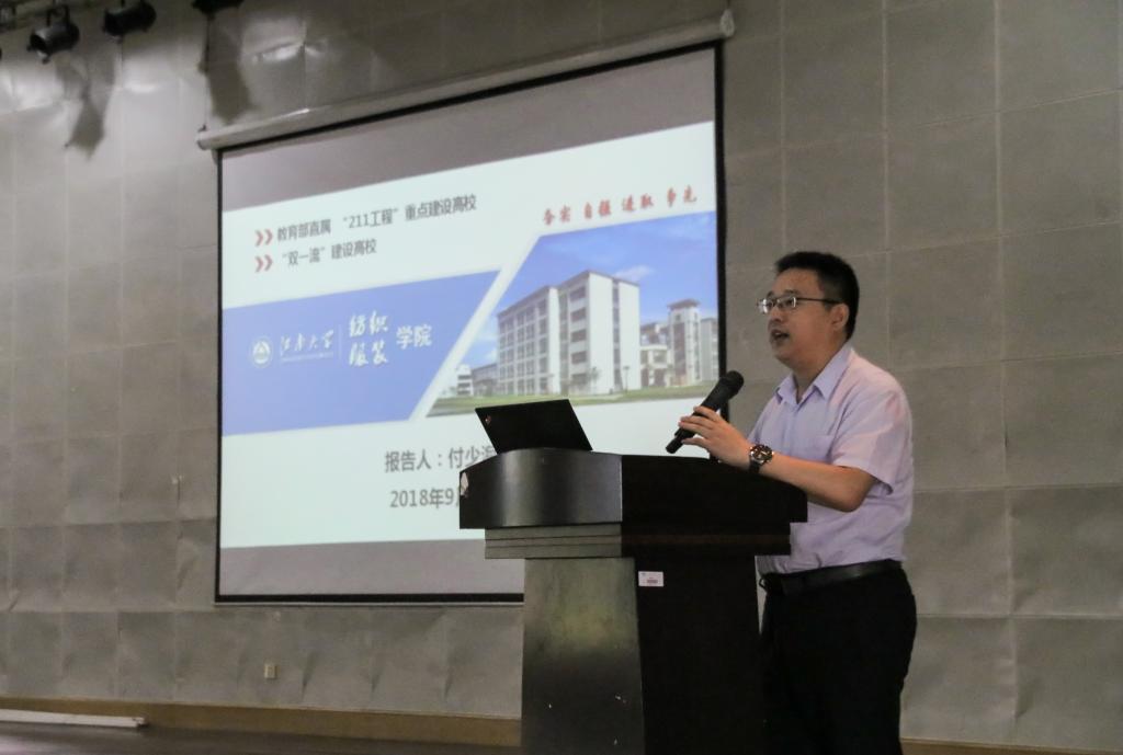 随后,付少海院长向2018级新生介绍了学院的历史沿革和基本情况,重点向新生介绍了学院的人才培养情况以及学科建设情况等。他勉励新生铭记“笃学尚行,止于至善”的校训,积极参加各类学术活动,努力学习,不负大学的青春岁月。