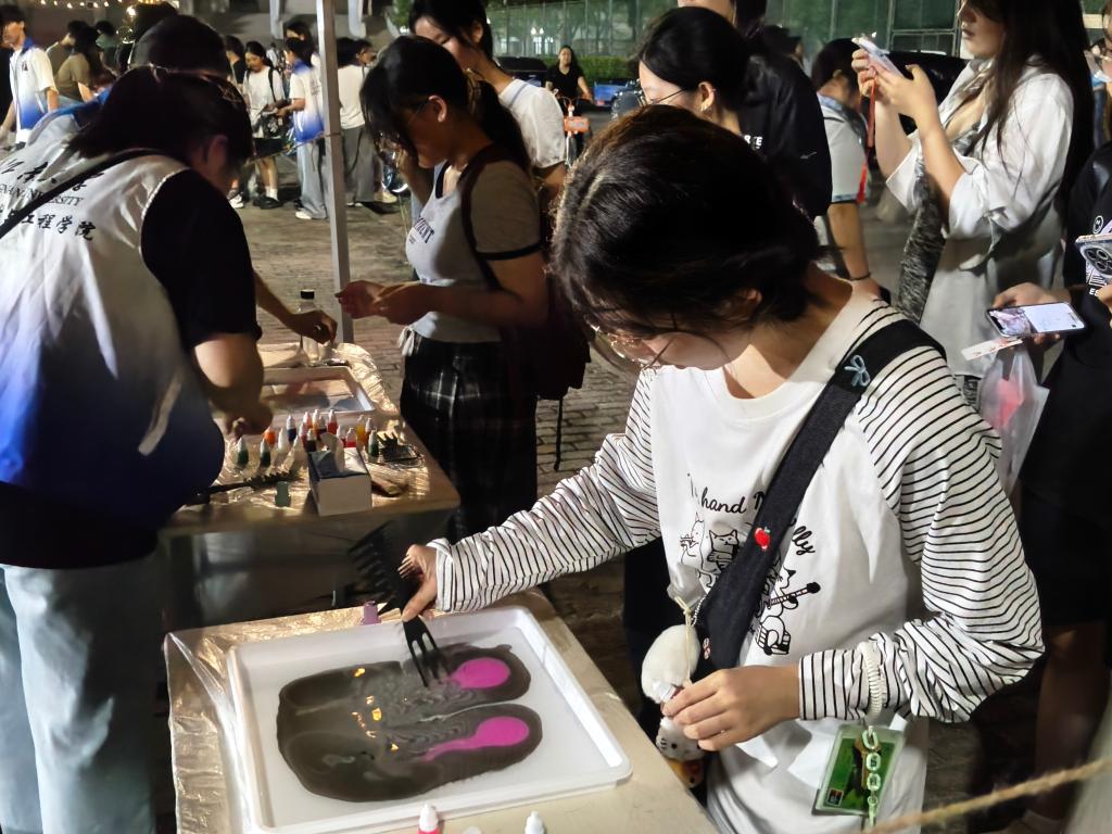 当艺术的灵感与纺织的专业知识相遇,便诞生了“匠心文化”的独特魅力。在水拓丝巾的流光溢彩与丝网印花的巧思印制中,充满热情的新生们不仅创造了独一无二的作品,更在趣味的体验里,完成了对纺织文化之美的一次生动探索。