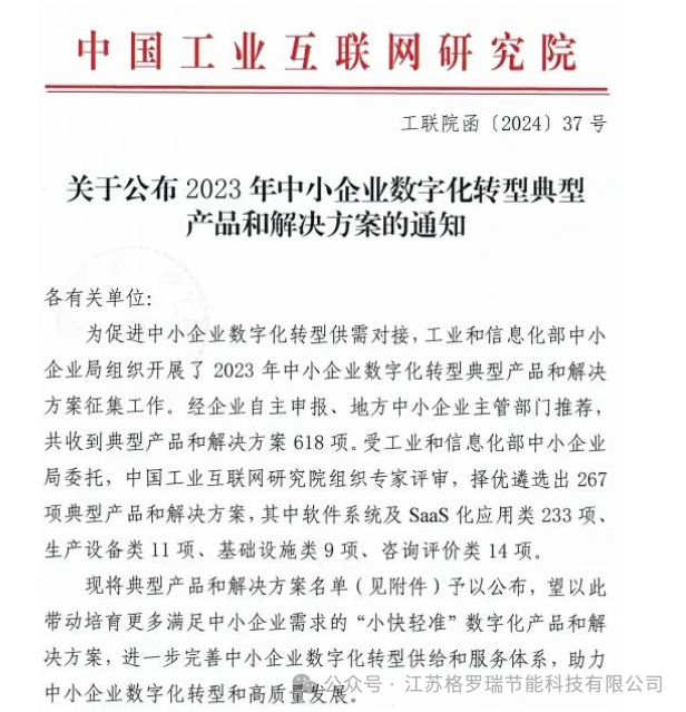 近日,我院校友企业江苏格罗瑞节能科技有限公司的“基于高端纺织业的数字化应用解决方案”荣获国家级荣誉,被工业和信息化部中小企业局选入2023年中小企业数字化转型典型产品和解决方案之列。