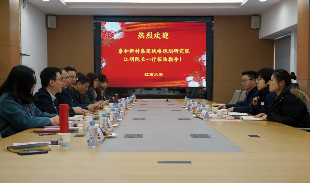 1月30日,泰和新材集团股份有限公司战略规划研究院院长江明、副院长关振虹,携相关部门负责人一行莅临bv伟德国际1946交流合作。学院院长付少海、产业技术研究院副院长谢卫忠、学院副院长马丕波、针织技术教育部工程研究中心主任蒋高明、副主任丛洪莲,以及十余名教授出席会议。会议由马丕波主持。