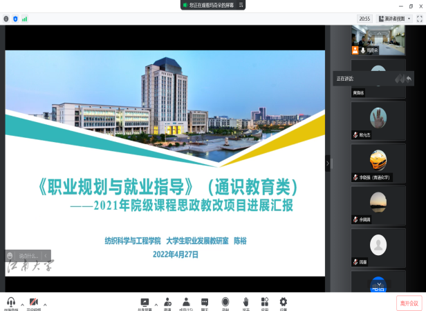 2022年4月27日下午,纺织学院通过线上线下结合的形式召开了院级课程思政中期检查暨工作推进会。全体院领导、系主任、教改项目负责人参加了会议。会议由副院长黄锋林主持。