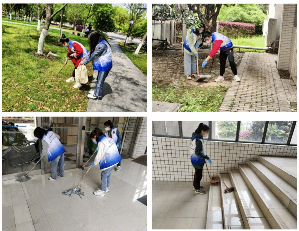 学生党员正在清理牡丹园及纺织楼道