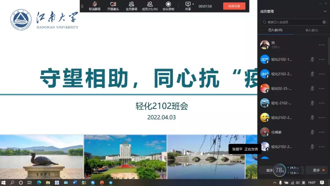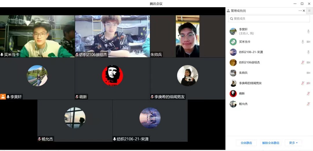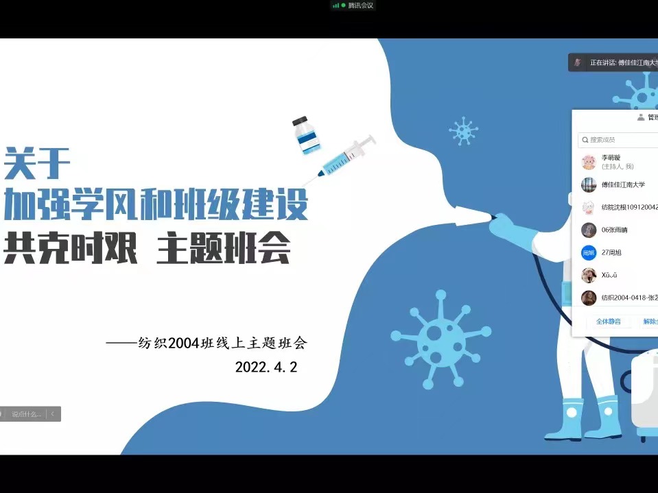 “大家都在线了吗?都能听到吗?” 隔离不隔心,关爱一直在线。近日为贯彻学校疫情防控工作的部署和要求,关心和指导在校学生有序开展学习和生活,学院34位本科生班主任,在校园封闭式管理的关键时期,通过云班会与班级学生畅谈规划、化解焦虑、共话成长,做到主动出击、有问必答,助力守护平安江南,助益纺织学子向阳前行。