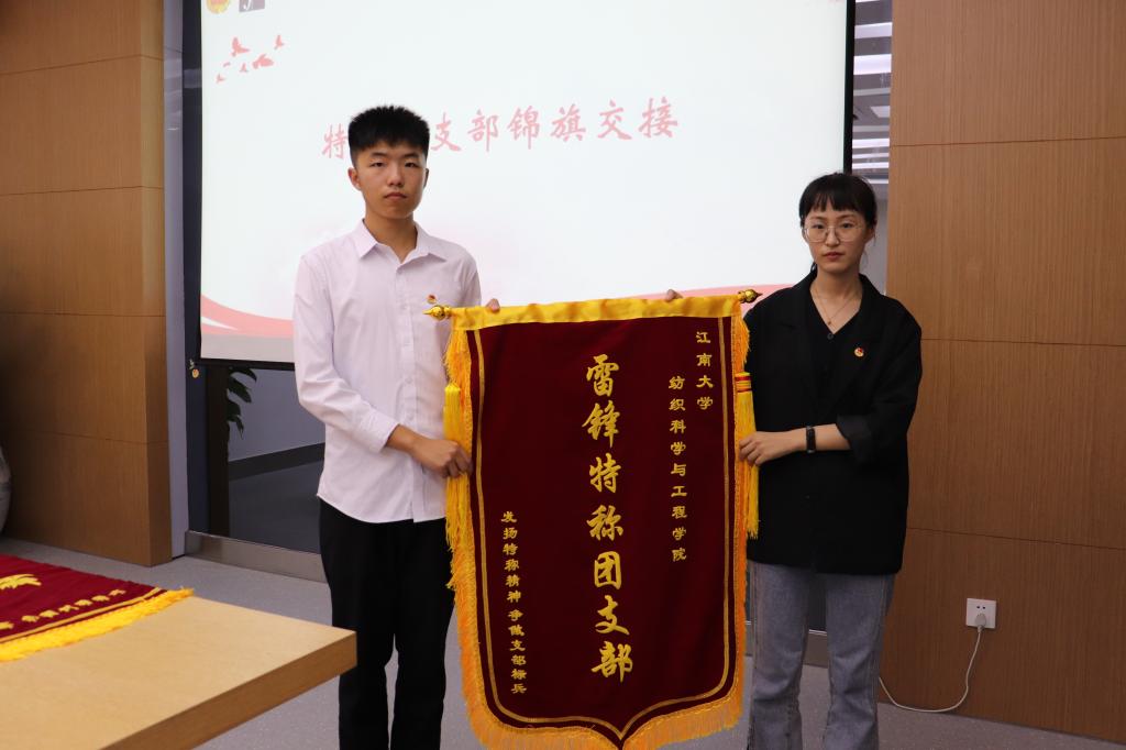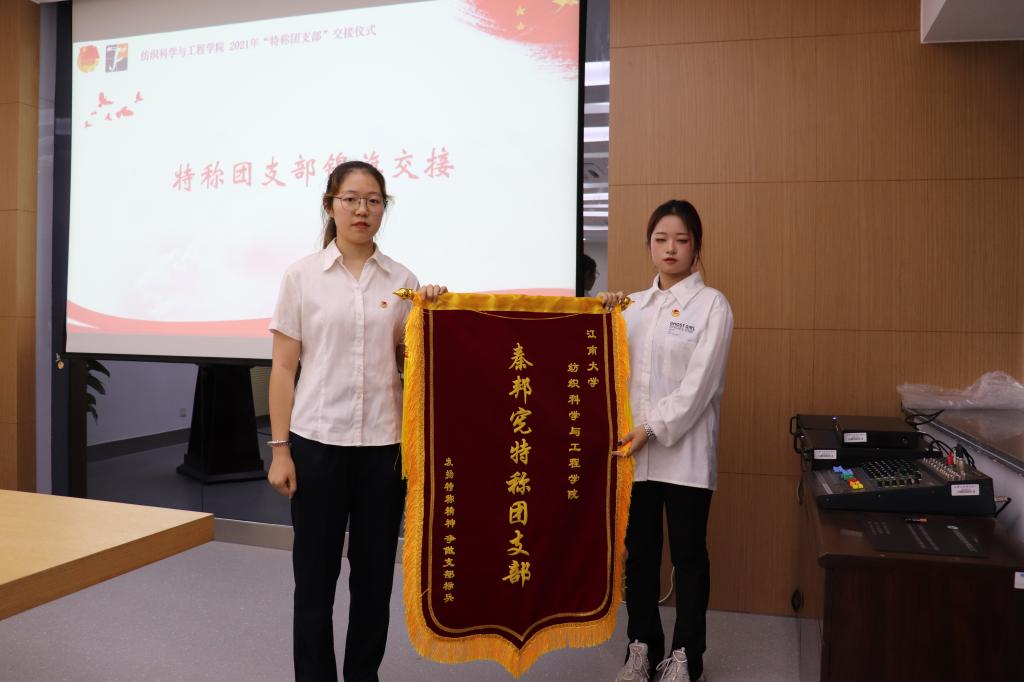 “雷锋特称团支部”由纺织1805班团支部交接给纺织2002班团支部,纺织1805班团支书王志辉从学风建设、创新创业、班团建设、志愿服务四个方面回顾了该团支部的工作,展现了纺织1805团支部全体班团干部、团员从成立支部以来的成长与蜕变;并寄语纺织2002团支部,传承雷锋精神必须发自内心地认同雷锋精神,真心实意地践行雷锋精神,而不能流于形式、止于口号。“秦邦宪特称团支部”由纺织1901班团支部交接给纺织2003班团支部,纺织1901班团支书陈丽娜同学从树立良好的团支部学风、建设正确的思想文化高地、培养优秀的班团干部、组织丰富的班团活动四个方面阐述了这一年的工作;并希望纺织2003班团支部全心全意为同学们服务,团支部成员对自己高标准、严要求,以秦邦宪同志为理想奋斗的精神、坚定革命信念的勇气为船,航行在青春的海洋中。随后,新老“特称团支部”进行锦旗交接,纺织2002班雷锋特称团支部、纺织2003班秦邦宪特称团支部进行表态发言,一定会接好接力棒,将特称团支部精神传承下去。接着,轻化1903张闻天特称团支部团支书张宇婷说团课《青春跟党走,建功新时代》,深入浅出地介绍了“工匠精神”的内涵及意义,希望同学们要用青春作桨、以梦想为帆,让青春之光照亮奋进之路。随后,全体师生起立歌唱中国共产主义青年团团歌《光荣啊中国共青团》。