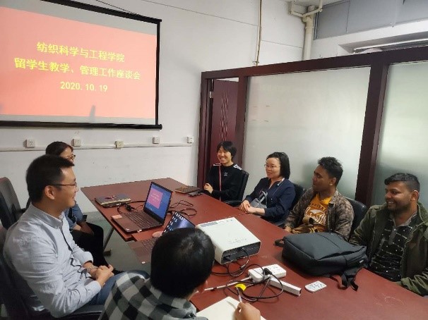10月19日,bv伟德国际1946的留学生教学、管理工作座谈会在纺织学院举行。纺织学院副院长黄锋林、刘庆生,纺织工程系系主任傅佳佳,留学生班主任柯莹、徐荷澜、崔鹏,以及在校留学生代表卡萨那和萨拉查参加了座谈会