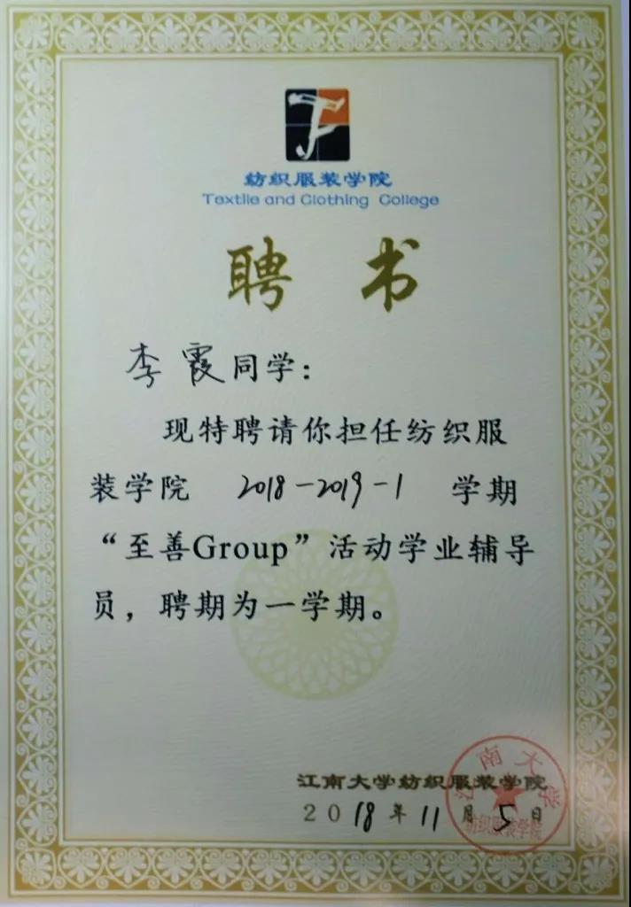 我很荣幸在大一时入选了我们学校的荣誉学院——至善学院。至善学院是伟德bv1946选拔拔尖人才的基地,从各学院选取成绩排名前3%的同学组成虚拟学院。“在其位司其职”,在以后的日子里我不敢有所懈怠,努力丰满自己的羽翼。大一学年获得了国家励志奖学金,学业二等奖学金。
