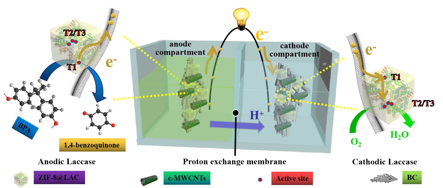 bv伟德国际1946魏取福教授团队采用新型多孔有机金属框架材料作为酶分子固定化载体,得到了具有优异稳定性的固定化酶,并将其用于制备一种可同时作为酶生物燃料电池阴极和阳极的纤维素基高柔性电极,最终基于分子内电子转移的新概念(Chem. Eng. J., 379 (2020) 122316)构建单酶生物燃料电池基自供能传感器,实现了对酚类污染物的自供能检测。该项工作近日以题为“Encapsulation of Enzyme by Metal-Organic Framework for Single-Enzymatic Biofuel Cell-Based Self-Powered Biosensor”的研究论文被发表在Nano Energy杂志(Nano Energy68 (2020) 104308)