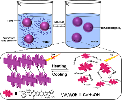 该材料是一种复合染料纳米颗粒,通过正硅酸四乙酯缩水聚合的方式包裹一种自制的双吲哚并喹吖二酮(IQA)有机染料分子和脂肪醇获得。研究发现,该材料的变色机理源自于IQA分子在脂肪醇溶剂中可调节的解离/聚集机制。而IQA分子的解离与聚集状态直接取决于溶剂的熔融和凝固。因此,通过改变溶剂组分,可以实现其变色温度的调控。此外,该材料可以通过常规的染整方法实现其在纺织品上的应用。