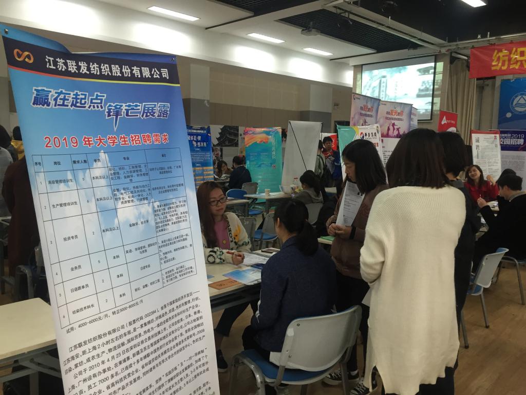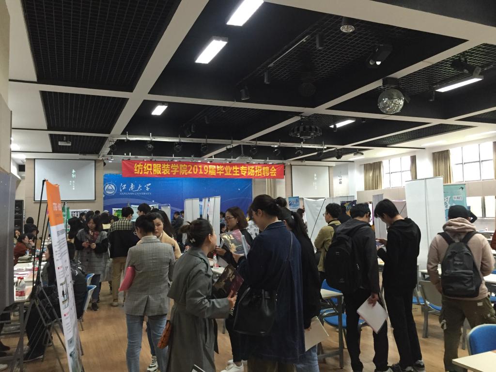 我院2019届毕业生共517人,其中本科毕业生363人,研究生毕业生154人。本次招聘会共有来自省内外的65家纺织、轻化、服装行业的单位参会,其中包括江苏省纺织研究所股份有限公司、通标标准技术服务有限公司、江苏红豆国际发展有限公司、浙江恒逸集团有限公司等国内知名企业,共为毕业生提供就业岗位1254个。本科生平均起薪:6000元/月,硕士研究生平均起薪:8000元/月,博士研究生平均起薪:12000元/月。