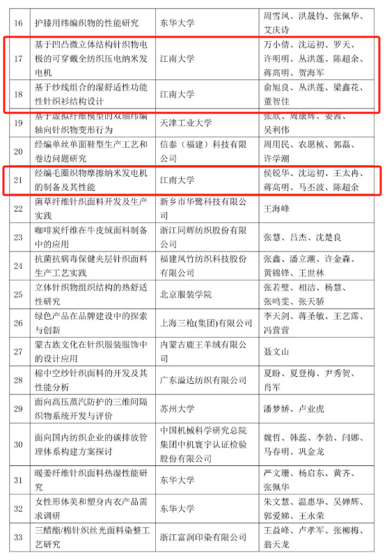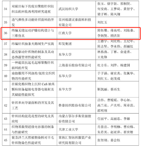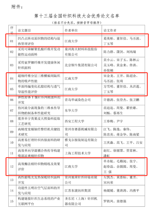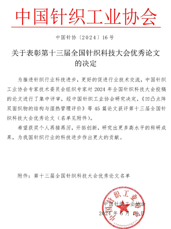 大会还进行了第十三届全国针织科技大会优秀论文颁奖,我院《凹凸点阵双面织物的结构与湿热管理评价》《超细纤维分层三维横编间隔织物的吸声性能》等8篇论文获评第十三届全国针织科技大会优秀论文(共评选出45篇),中国针织工业协会专家技术委员会主任瞿静、常务副主任杨启东为获奖者颁发了证书。
