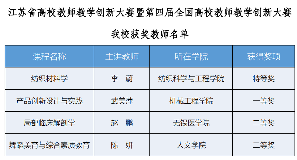 近日,第四届江苏省高校教师教学创新大赛获奖名单公布,伟德bv1946共有4位教师获奖。我院纺织工程系副教授李蔚主讲的《纺织材料学》荣获特等奖,实现了学校在该项赛事上的新突破。
