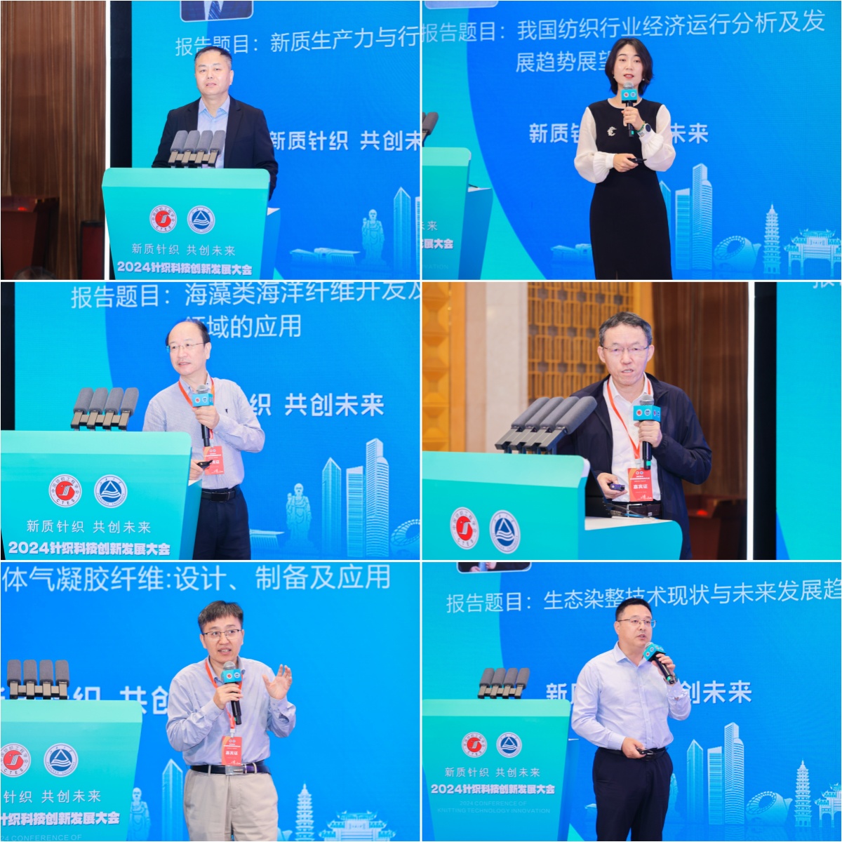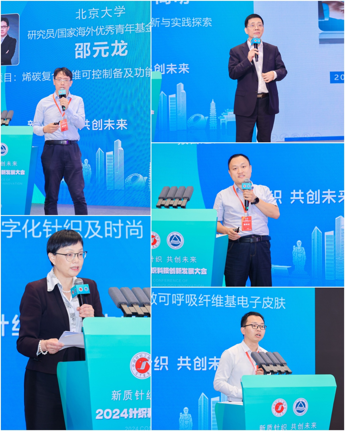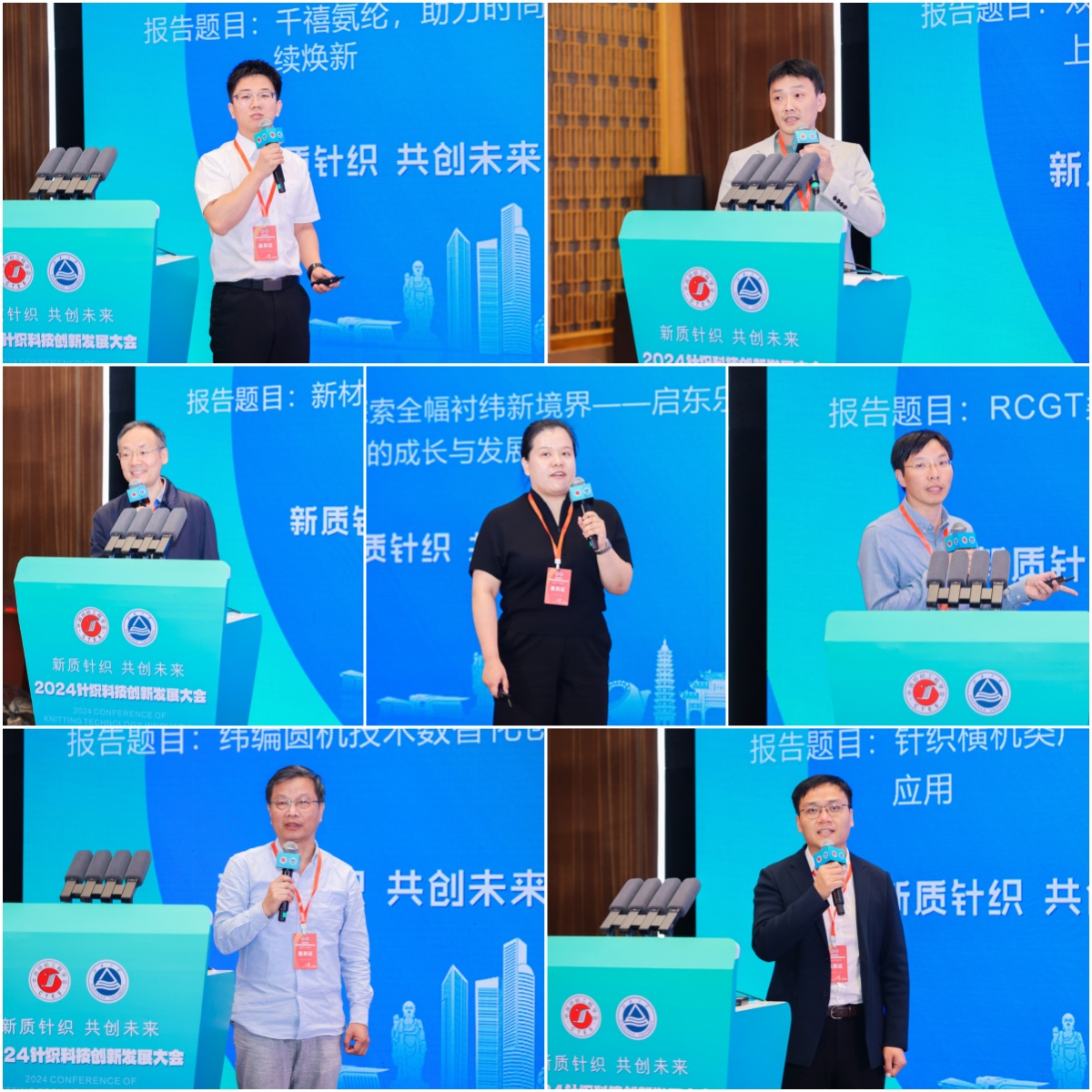 在报告交流环节,中国纺织工程学会理事长伏广伟,中国纺联产业部处长张倩,青岛大学教授、国家自然科学基金杰出青年基金获得者夏延致,武汉纺织大学教授、俄罗斯自然科学院院士梅顺齐,中科院苏州纳米所教授、科技领军人才张学同,bv伟德国际1946院长、科技领军人才付少海,北京大学研究员、国家海外优秀青年基金获得者邵元龙,美国路易斯安那州立大学教授刘传兰,伟德bv1946教授、中国纺织工程学会针织专业委员会主任蒋高明,东华大学教授、青年拔尖人才李召岭等分别以《新质生产力与高质量发展的几点思考》《我国纺织行业经济运行分析及发展趋势展望》《海藻类海洋纤维开发及在针织领域的应用》《新质生产力引领纺织智能制造高质量发展的体会》《胶体气凝胶纤维:设计、制备及应用》《纺织品生态染整技术研究现状与发展趋势》《烯碳增强纤维可控制备及功能化应用》《Machine Knitting for Fashion –A Focus on 3D/Whole Garment Knitting》《针织技术创新与实践探索》《高灵敏可呼吸纤维基电子皮肤》为题作行业发展思考报告和前沿领域研究分享。华峰化学股份有限公司,福建佶龙机械科技股份有限公司,安徽吴方机电科技有限公司,启东乐欣纺织科技有限公司,无锡市兴盛新材料科技有限公司,圣东尼针织机器有限公司,江苏金龙科技股份有限公司代表分别以《千禧氨纶,助力时尚产业可持续焕新》《双针床贾卡经编机在鞋面及服装上的应用和趋势》《新材料在织针上的应用及发展》《探索全幅衬纬新境界——启东乐欣的成长与发展》《RCGT柔软超高弹纤维》《纬编圆机技术数智化创新及其产品》《针织横机类产品发展趋势及创新应用》等为题,分享了公司的创新产品及应用案例。