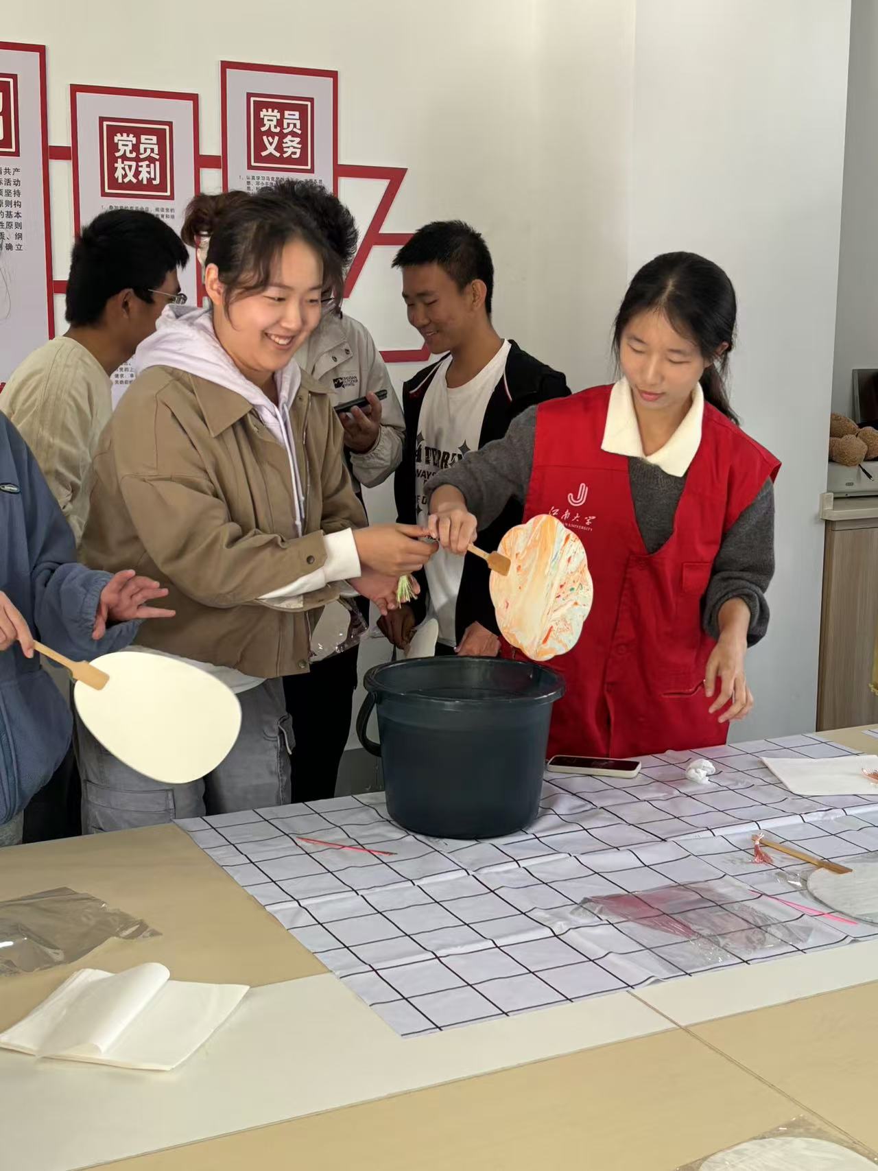 同学们充分发挥自身的想象力,将选好的色彩滴入水中,水因势而走,色彩穿插交错,一沉一提之间,漆料在扇子上翩翩起舞,提出水的扇面瞬间印上色彩绚丽的图案,一幅幅诗情画意的漆扇呈现在眼前,展现出制作者不同的个性与艺术才华。