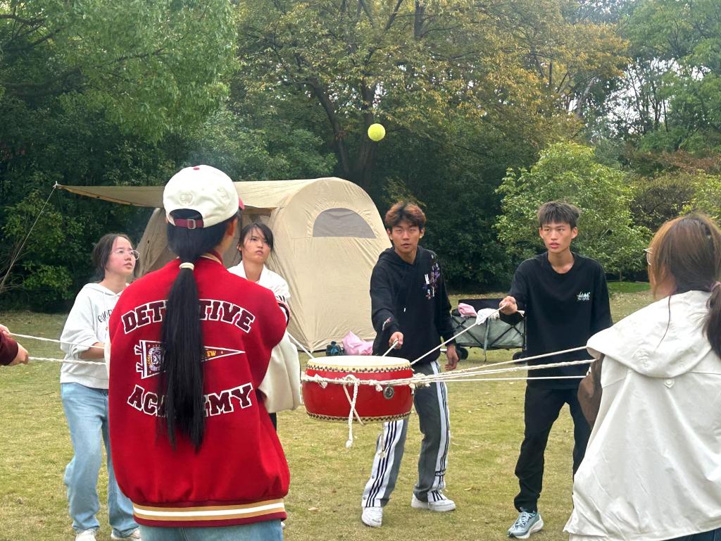 击鼓颠球,声声不息。在经典的同心鼓项目,同学们手持鼓绳,心连一心,创造了连续156次颠球的佳绩,充分展现出同学们团结协作的智慧与默契。