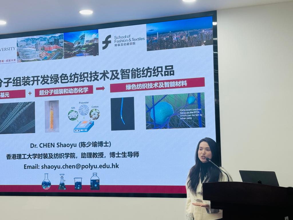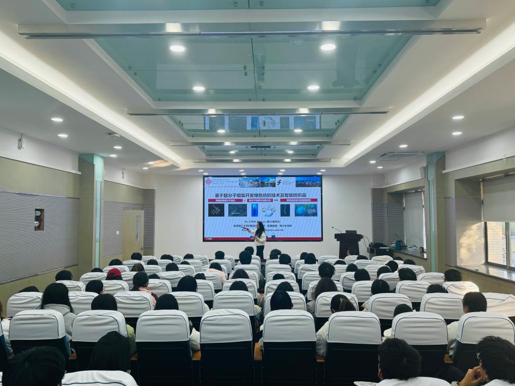 陈少瑜以“基于超分子组装开发绿色纺织技术及智能纺织品”为主题,与大家分享了自己在智能纺织品领域的最新研究成果。她表示智能纺织是纺织科技领域的一个热点研究方向,随着物联网、大数据和人工智能技术的不断发展,智能纺织品在远程医疗保健、运动监测、智能家居等领域展现出巨大的应用潜力。在交流互动环节,她耐心回答同学们关于纺织科技、智能纺织等方面的问题,并分享了自己的科研心得和职业发展建议。她鼓励在座的学弟学妹们要勇于追求自己的梦想,不断学习和创新,为纺织科技的发展贡献自己的力量。