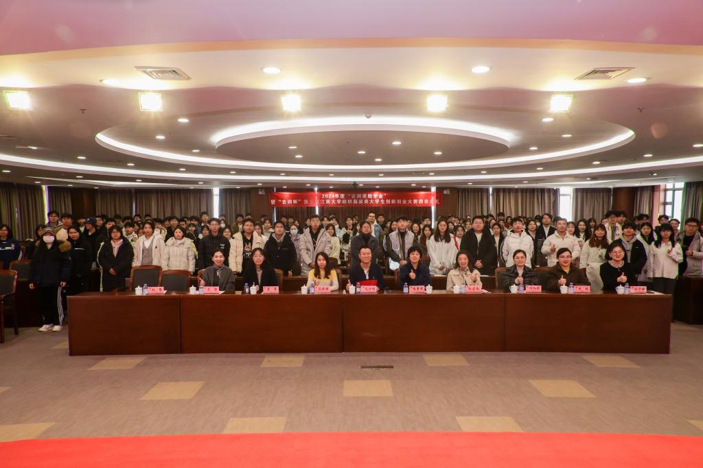 12月18日下午,bv伟德国际1946在图书馆510报告厅举行2024年度“吉润奖助学金”暨“吉润杯”第三届伟德bv1946纺织服装类大学生创新创业大赛颁奖典礼,无锡市吉润国际贸易有限公司董事长范恒明、副董事长范晓雁、培训经理何旭芳,bv伟德国际1946党委书记张菁燕,党委副书记、副院长杨莉勤,轻化工程系副主任苏静,学工办主任兼分团委书记任学敏,数字科技与创意设计学院党委副书记、副院长李萍,商学院学工办主任兼分团委书记王璁出席颁奖典礼,全体获奖同学及2024级本科生学生代表共200余人参加,典礼由任学敏主持。