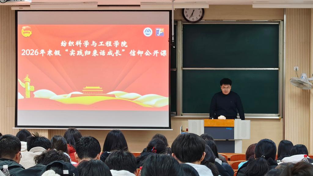 在本次寒假“冬日织悟实践行”社会实践中,各团队围绕不同主题开展了一系列紧扣时代主题,内容丰富形式多样的社会实践活动。“纺铸初心,寻迹织路”实践团成员们通过实地走访和沉浸式学习,在历史与现实的交汇中感悟初心使命,汲取奋进力量。张闻天特称团支部2024级纺织创新班以“深化同心固边”为主题,走进红色纪念馆、爱国主义教育基地,深化对总体国家安全观的理解,让青春在践行爱国使命的路上步履不停。“寻‘纺’文化根脉,讲好中国故事”实践团走进博物馆、非遗工厂等文化场馆,触摸历史温度,溯源文明根脉,以青春脚步丈量文化传承之路,用年轻声音讲述时代故事。“文脉传承,薪火相传”实践团以传承中华优秀传统文化为初心,在行走中探寻文化根脉,在实践中感悟匠心传承,以纺织青年的热忱与行动,书写文化传承的新篇章。钱之光特称团支部2025级纺织创新班以红色精神赋能,创新实践筑梦,将红色研学,专业实践,产业创新有机融合,在实践中感悟创新力量,明确青春使命。“纺承乡土韵,织就振兴图”实践团将传统纺织技艺传承和乡村人文关怀深度融合,让纺织文脉在乡土间焕发新活力,为乡村振兴注入青春动能。“经纬织梦,红色薪火”实践团以纺织学子的独特视角,探寻红色印记、感悟精神力量,让红色基因和纺织精神双向奔赴、代代相传。基层服务治理实践团走进一线,在入户走访中倾听民生,在志愿服务中脚踏实地,在文明治理中守正创新。八位实践团的团队代表依次登台分享他们的实践故事,用鲜活案例展现知行合一的青春力量。