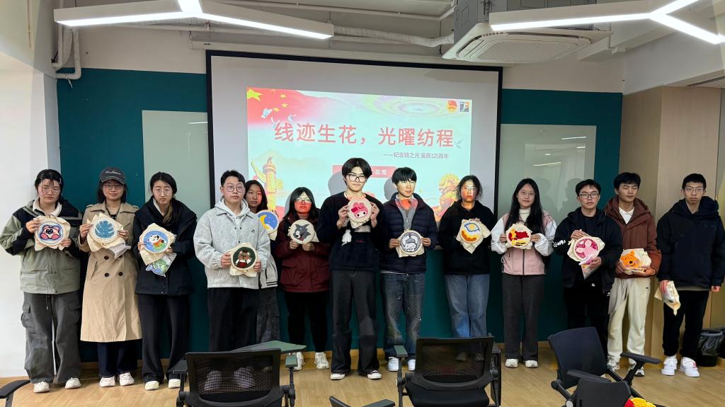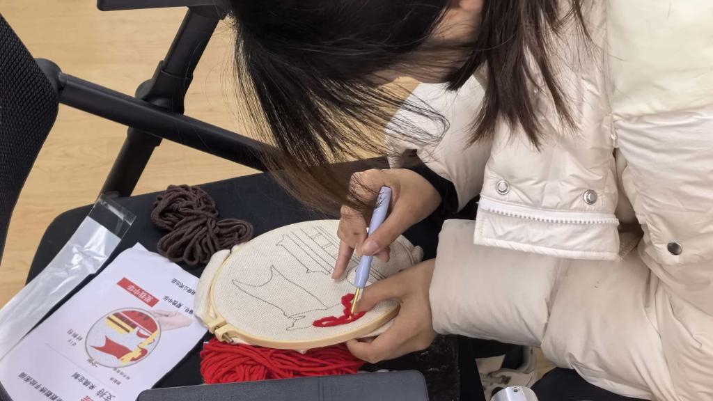 科普环节落幕,纺织戳戳乐创作正式启幕。同学们以针为笔、以线为媒,将红色文化、报国情怀融入创作,精心甄选底稿、搭配彩线,在工作人员指导下执针穿梭、层层堆叠,让精美图案跃然布面。现场氛围热烈温馨、创意涌动,大家把红色信仰织进经纬,将匠心初心注入作品,红色主题纹样与创意图案相映成趣,件件作品饱含赤诚、栩栩如生,既彰显青年创新活力,又尽显纺织工艺之美。