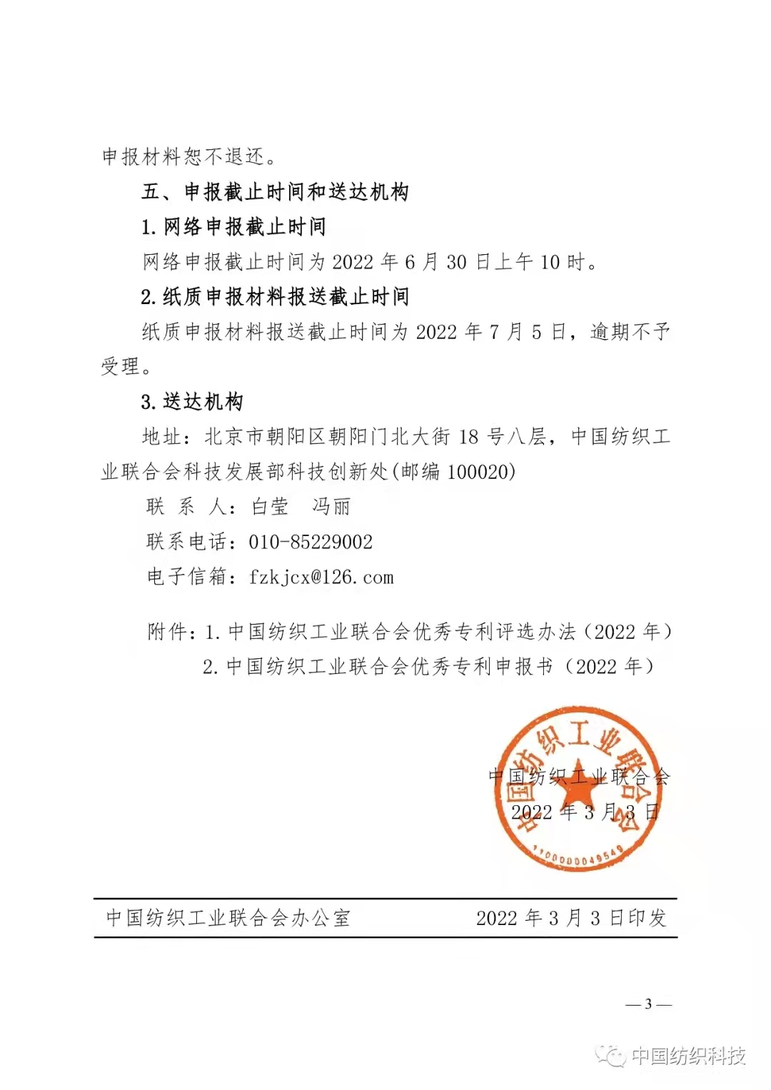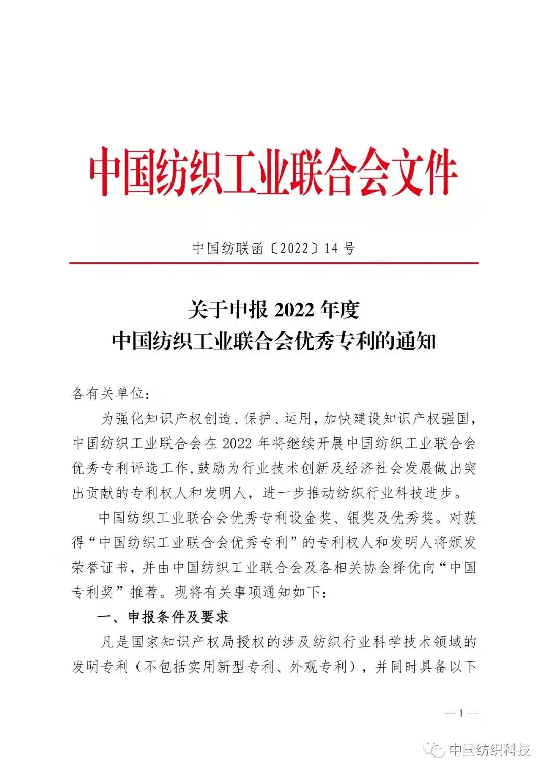 2022年度中国纺织工业联合会优秀专利申报工作已经开始,具体通知如下: