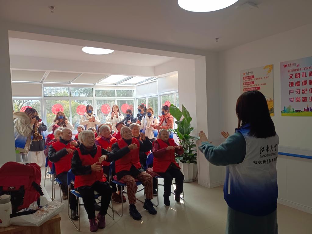 在活动开始前,学院青年志愿者协会与养老院负责人进行联络沟通,了解老人的需求以及服务时的相关注意点,随后在全校范围内招募了三十多位热情开朗、善于沟通的志愿者。活动当天,迎着初春晨光,准备充分的志愿者们在学校门口集合,一同前往养老院。进入养老院前,在负责人的带领下,志愿者们先进行了抗原检测,以确保活动安全展开。据事先了解,手势舞深受老人们的欢迎,在简单的介绍后,部分志愿者进行了手势舞的表演,老人们认真学习手势舞,同时也乐于分享自己的生活,讲述自己的故事与感受,老人们与志愿者跟随着音乐一起进行了“成果展示”,老人们脸上也都洋溢着快乐与幸福的笑容。在学习完手势舞之后,志愿者们又为老人呈现了精彩的节目表演。单口相声结合敬老爱老,将青年人对老人的理解与关心融入其中,加上志愿者绘声绘色的表演,不仅令老人们笑声不断,也让笑声中夹杂了些许感动。空手道劈木表演以及舞剑表演也都精彩纷呈,志愿者们表演时所呈现的力量感、节奏感体现出青年的蓬勃朝气,引得老人们发出阵阵惊叹。与此同时,为了照顾不方便外出参加活动的老人,另一批志愿者前往各个房间陪伴老人,志愿者们与老人互相分享自己的生活,畅聊故乡与往事。
